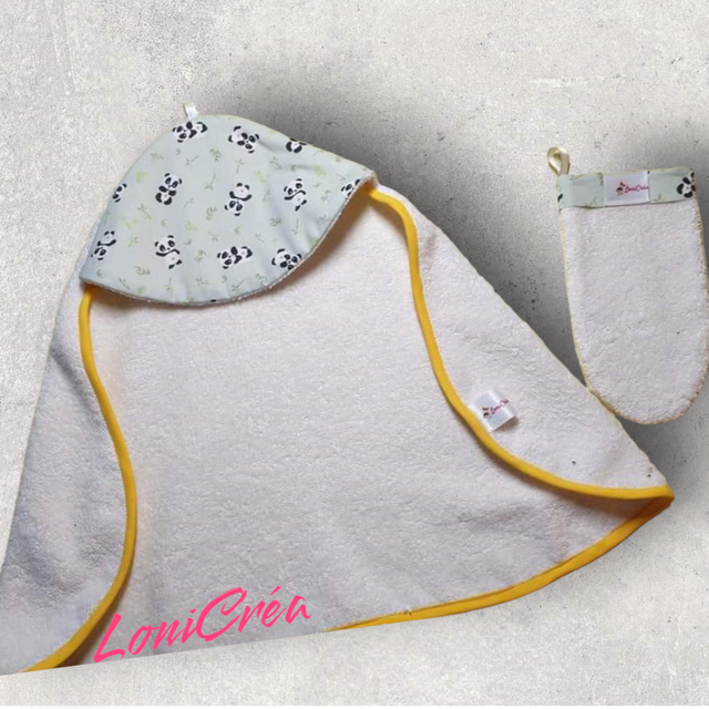 Cape de bain hauteur 41 cm et gant 19x10 cm.